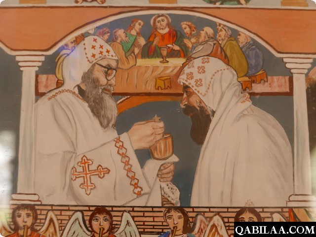 - تواجدت كتابة أجيوس اوثيئوس وهو يسمى بقدوس الإله، ويعتبر إشارة كبيرة على أن الله يحيط بالكنيسة من كل ناحية وكذلك تواجد الصليب في المنتصف.
