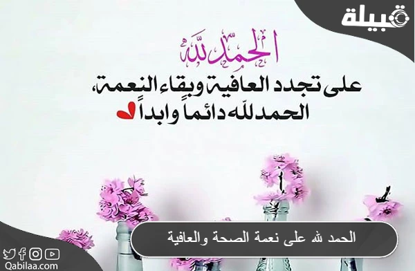 الحمد لله على نعمة الصحة والعافية والحمد لله الذي أعطانا القوة، الحمد لله على نعمة الشفاء من المرض، اللهم يسر لنا أسباب الخير والسعادة، الحمد لله الذي جعلني ممن يحلون حلاله ويحرمون حرامه.