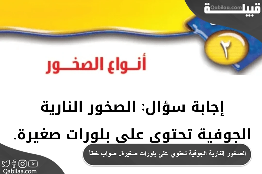 الصخور النارية الجوفية تحتوي على بلورات صغيرة. صواب ام خطأ .. أبنائنا وبناتنا طلاب الصف الأول المتوسط بـ المملكة العربية السعودية يبحثون عن إجابة هذا السؤال الوارد بـ مادة العلوم، تحديدًا بـ الفصل الدراسي الثاني، ونحن هنا لـ تقديم الإجابة إن كانت صواب فـ لماذا وإن كانت خطأ فـ ما هو التصحيح ؟ إليك الإجابة إجمالًا وتفصيلًا أدناه.