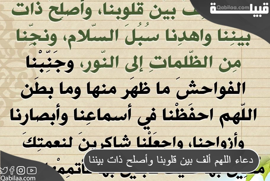 - يا مؤلف القلوب الف بين قلوبنا كما ألفت بين المهاجرين والأنصار، وألف بيننا وبين عبادك الصالحين.