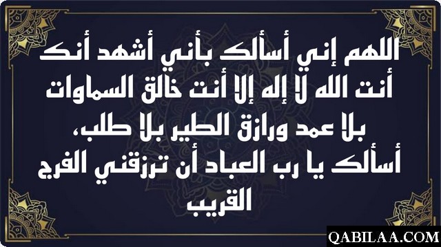 - اللهم إني أسألك بأني أشهد أنك أنت الله لا إله إلا أنت خالق السماوات بلا عمد ورازق الطير بلا طلب، أسألك يا رب العباد أن ترزقني الفرج القريب.