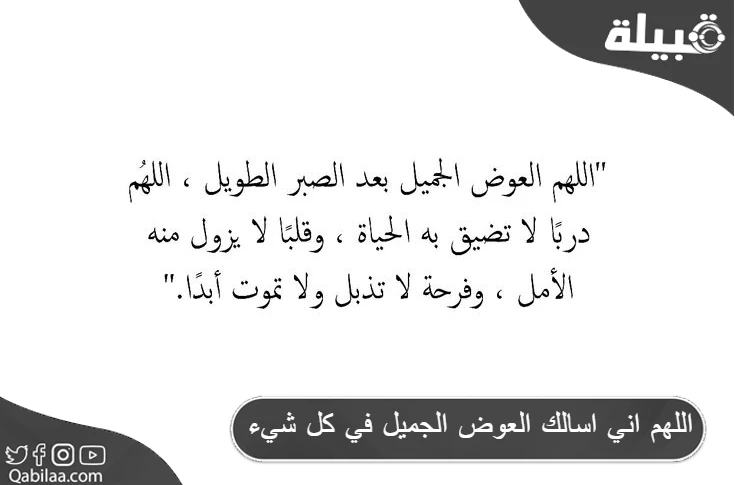 - اللهم اني اسالك العوض الجميل في كل شيء، اللهم عوضني خيرا وارزقني خير القدر، اللهم اجعلني من الهادين القانتين، واصرف عني المحن والبلاء وسوء الحال.