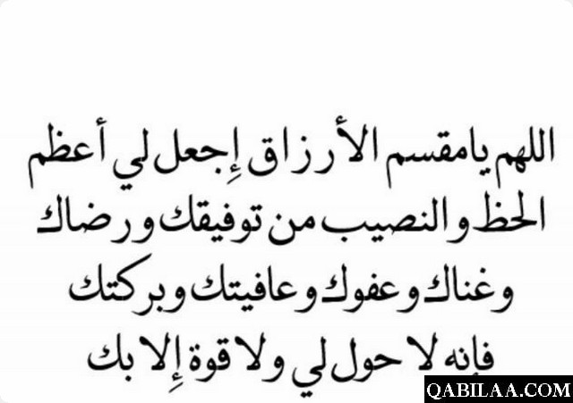 يارب يا مقسم الأرزاق، اقسم لي بأحسنه واجعل لي نصيبًا من التوفيق والرضى، اللهم اغنني من فضلك وارزقني من واسع كرمك، اللهم أنت الحليم فلا تعجل، وأنت الجواد فلا تبخل، وأنت العزيز فلا تذل، وأنت المنيع فلا ترام، وأنت المجير فلا تضام، و أنت على كل شيء قدير، لا إله إلا أنت ولا حول ولا قوة إلا بك.