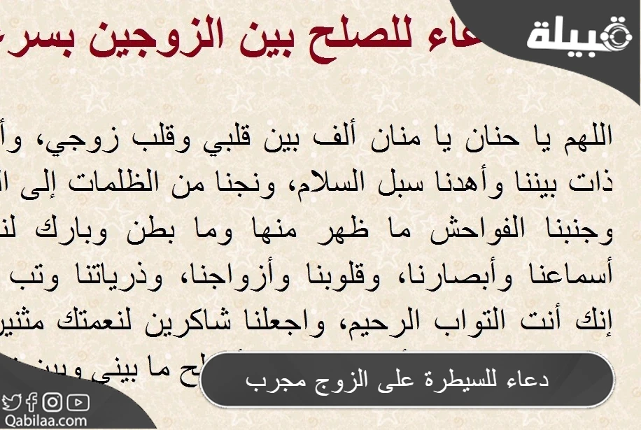 تعتبر السيطرة على الزوج من أهم أهداف الكثير من الزوجات التي تسعى كل واحدة لديها زوج ينظر إلى الأخريات في تفعيلها حيث تحرص على مراقبته حتى يبتعد عن أي فتاة أخرى تقابله سواء في العمل أو من الأهل، ومن أشهر أدعية النساء للسيطرة على الزوج ما يلي: