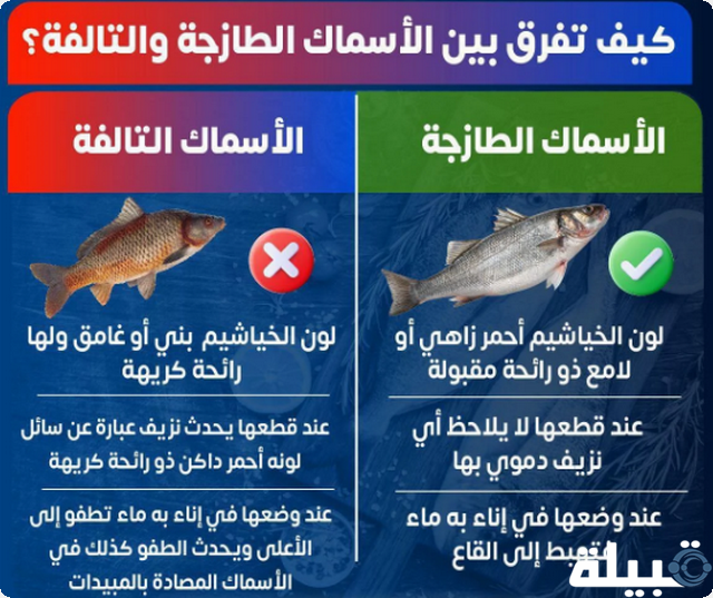 للإجابة عن كيف تفرق بين الأسماك الطازجة والتالفة؟ قام موقع قبيلة بتوضيح بعض الفروق مثل: الأسماك الطازجة تتميز بخصائص محددة يمكن للمستهلكين استخدامها للتمييز بينها وبين الأسماك التالفة، يمكن التعرف على الطازجة منه من خلال لون خياشيمه